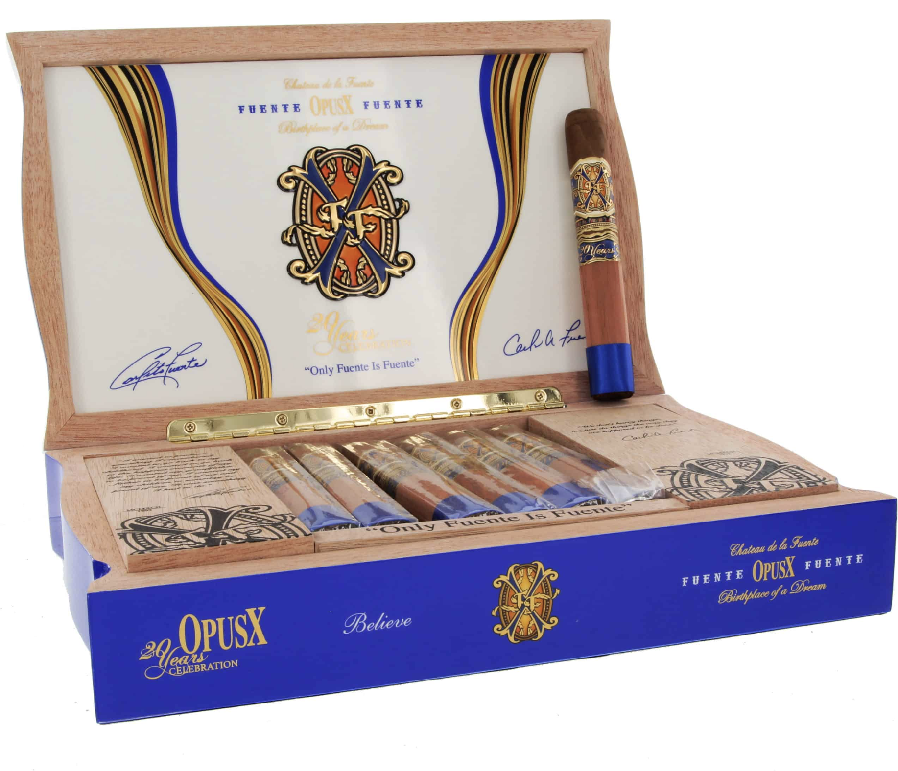 The Fuente Fuente Opus X 20th Anniversary Believe is a 5 3/4″ x 52 Toro-sized cigar that celebrates two decades of the legendary Opus X line. Handmade in the Dominican Republic, this special edition cigar features the signature Dominican Sun Grown wrapper, which imparts bold and complex flavors. The blend of aged Dominican tobaccos for the binder and filler creates a rich, layered profile with notes of dark chocolate, black pepper, coffee, leather, and a hint of spice, all balanced by the natural sweetness of the wrapper.