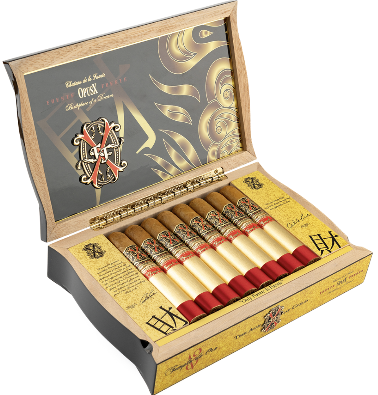 The golden-toned wrapper distinguishes this cigar visually and stylistically from classic Opus X expressions, delivering a refined interpretation of the blend while preserving the richness and complexity expected from Fuente Fuente Opus X. Beneath the wrapper lies a carefully aged Dominican binder and filler blend grown at Chateau de la Fuente, resulting in a layered profile of cedar, toasted wood, soft spice, mineral depth, and subtle sweetness.